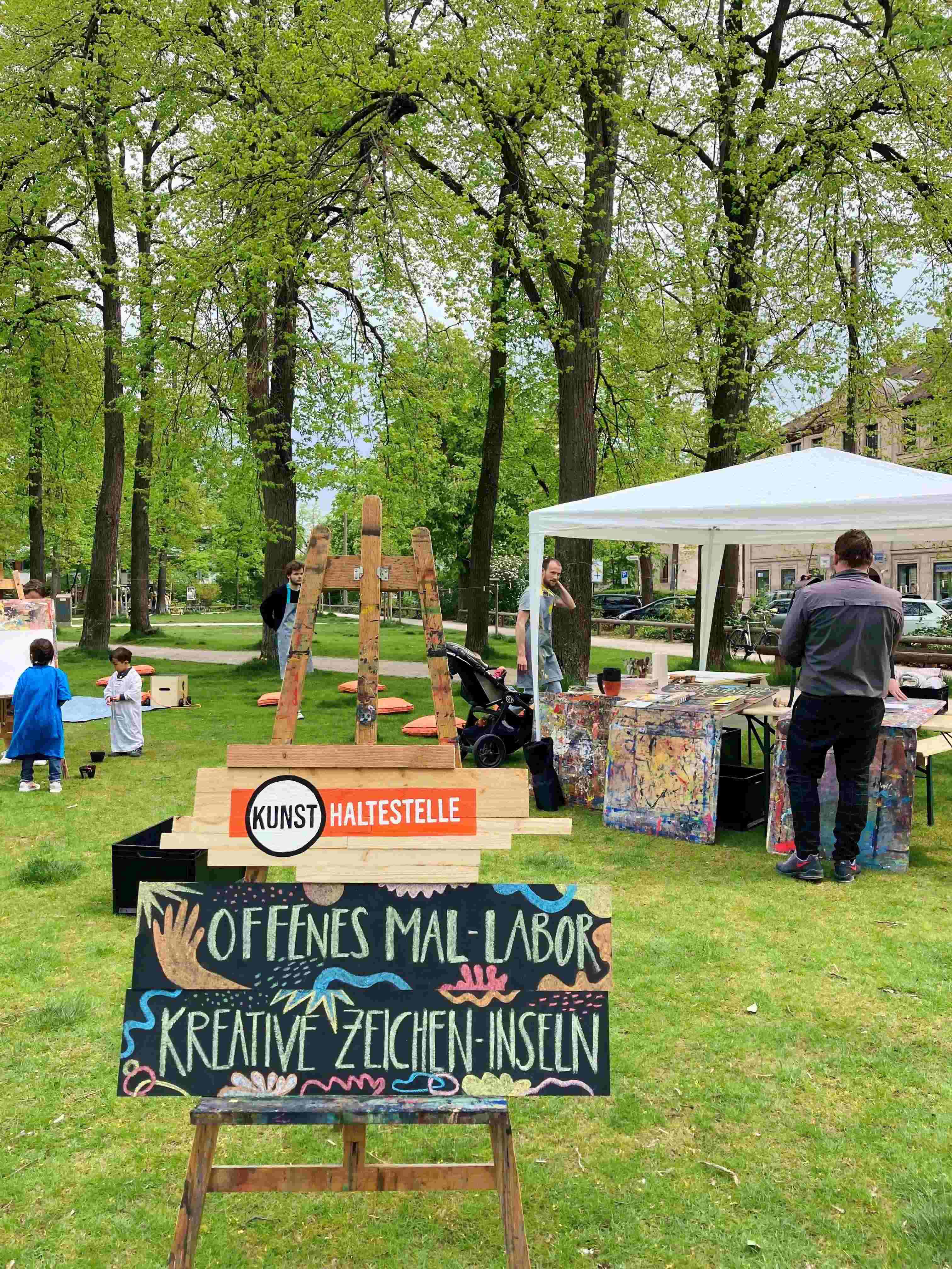 „Die Kunsthaltestelle“ ist ein Projekt der Jugendkunstschule Erlangen, das seit 2021 über die Sommermonate hinweg an bis zu elf Samstagen für jeweils drei Stunden stattfindet. Der JuKS-Bus fährt an unterschiedliche Orte im Erlanger Stadtgebiet und hat viele Staffeleien, Kreativmaterialien und Farben im Gepäck. Die Jugendkunstschule bietet mit diesem Projekt ein niederschwelliges, kostenfreies Kreativprogramm ohne Anmeldung für Kinder, Jugendliche, Familien und Erwachsene an. Viele Erlanger Bürger*innen, insbesondere Familien und Kinder, kennen das Angebot mittlerweile und kommen gezielt zu den Kreativ-Aktionen. Manchmal verbindet sich die Kunsthaltestelle auch mit Schulprojekten oder anderen öffentlichen Veranstaltungen wie Stadtviertelfesten. Neben freiem Malen gibt es jedes Mal eine Gestaltungsaktion, zum Beispiel werden mit Naturmaterialien Traumfänger gebaut oder aus Upcyclingmaterial eigene Maluntensilien hergestellt. Insgesamt liegt der Fokus auf der künstlerischen Praxis, dem experimentellen Gestalten, dem Prozess und der Freude am Tun. Das Angebot basiert auf den Prinzipien Partizipation, Freiwilligkeit und Niedrigschwelligkeit. Das Ziel der Kunsthaltestelle ist es, den öffentlichen Raum mit Kunst, Kreativität und Freude einzunehmen, eine Teilhabe barrierefrei zu ermöglichen und zur Selbsterfahrung und -entwicklung der Teilnehmenden beizutragen.