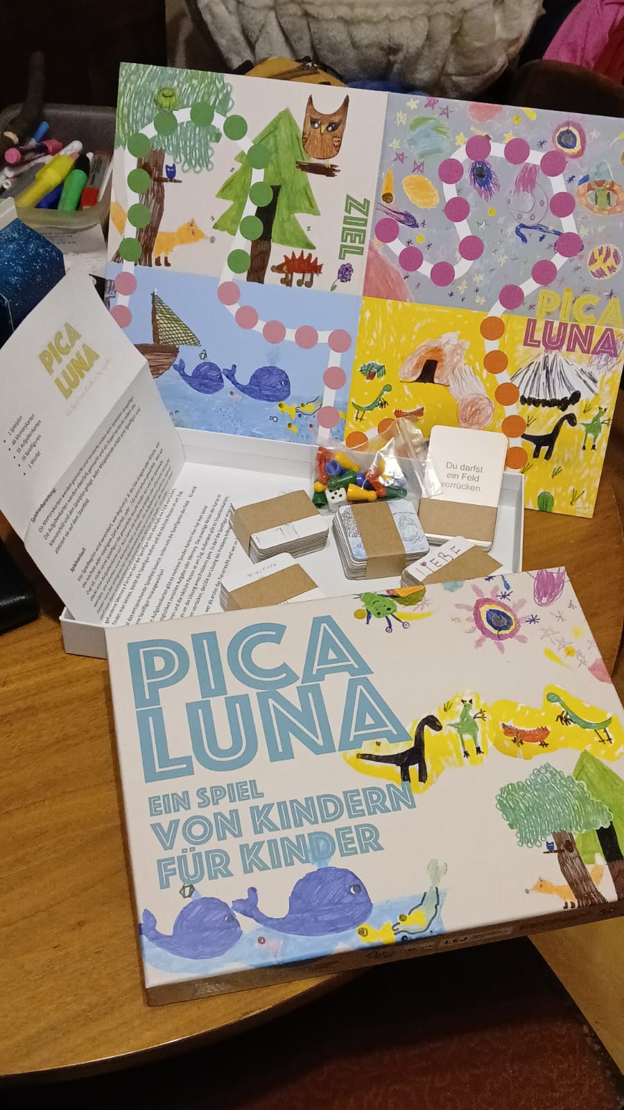 In einem von Bodyshaming und Intoleranz geprägten Umfeld verfolgte das Projekt „Picaluna“ das Ziel, mit Kindern gemeinsam ein Gesellschaftsspiel zu entwickeln. Die Teilnehmer*innen wählten dazu zwei Komponenten: Ein Memo-Legespiel und ein Brettspiel mit Start- und Zielfeld. Bei der Gestaltung galt es, Kompromisse zu finden, denn die Meinungen gingen sehr stark auseinander. Zusammen musste die Gruppe diskutieren und Lösungen finden, um zum Projektende ein detailreiches Gesellschaftsspiel herzustellen. Die individuell entstandenen Spielfiguren durften die Teilnehmer*innen am letzten Projekttag mit nach Hause nehmen, später erhielten sie auch ihr eigenes Spiel. Nach dem Projekt gab es weitere Treffen auf dem Gelände, da die Kinder des Viertels von der Pausengestaltung des Angebots angezogen worden waren. In Gesprächen wurden Konflikte im Stadtteil angesprochen und manchmal Lösungen gefunden. Daraus entstand die Idee, dass offen formulierte Fragen wie „Jemand mobbt dich. Was kannst du tun?“ dem Spiel hinzugefügt werden. So entstand eine Street-Version, die als mobiles Spiel aus- und weitergegeben werden konnte. Im Jahr darauf folgte ein Grundschulprojekt in der Ferienbetreuung. In der Zusammenarbeit entstand das Maskottchen Mr. Komika, das für eine Rätselkartenerweiterung zum Thema Gefühle sowie als Puzzle eingesetzt werden konnte.