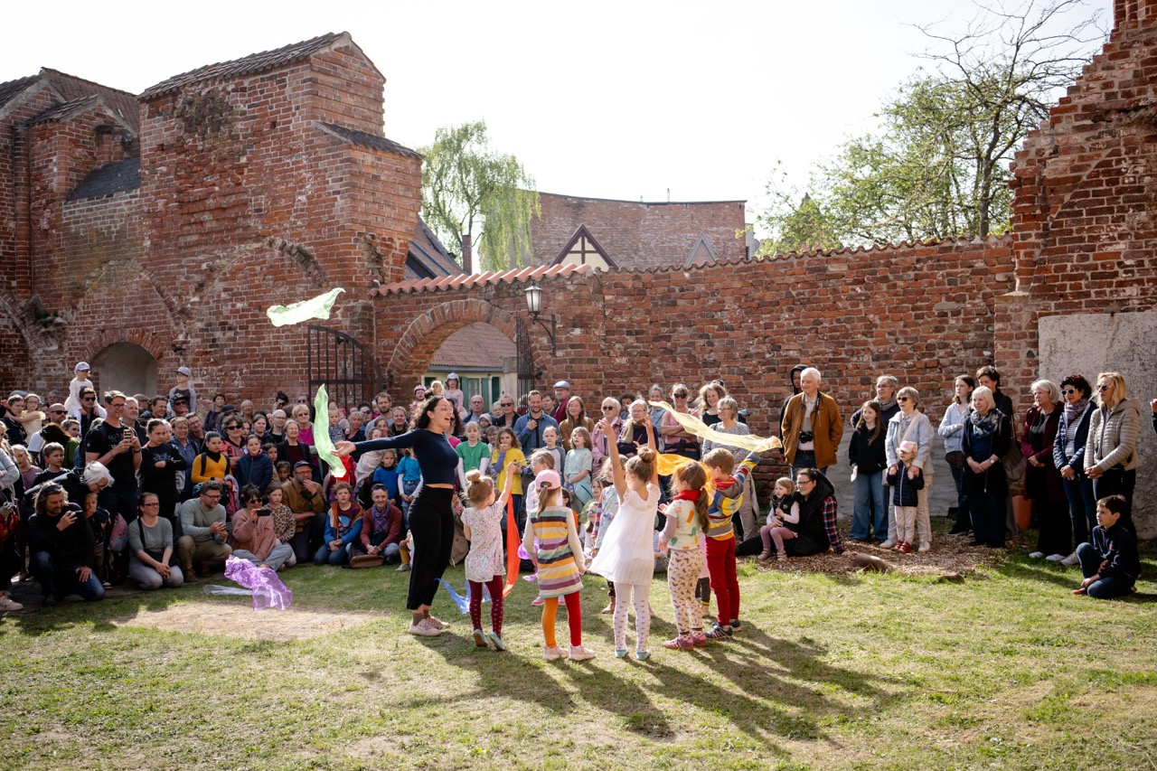 Am 29. April 2025 nutzten die Jugendkunstschule Vorpommern-Rügen und Perform[d]ance den Welttanztag, um gemeinsam mit dem STiC-er Theater, der Tanzschule arabesque sowie dem Ensemble Bunt an die Stralsunder Opfer des Holocaust zu erinnern. Mit Startpunkt am Johanniskloster führte der Weg durch die Stralsunder Altstadt, vorbei an verschiedenen Stolpersteinen und endete am Alten Markt mit einem gemeinschaftlichen Kreistanz zu jiddischer Musik. Etwa 200 beteiligte Tänzer*innen im Alter von 4 bis 80 Jahren führten zirka 400 Zuschauer*innen entlang der Route. Ein Schauspieler des Theaters Vorpommern referierte an den Stolpersteinen die Lebensgeschichten von deportierten jüdischen Menschen. Perform[d]ance, der Verein, der den Tanzbereich in der Jugendkunstschule Vorpommern-Rügen verantwortet, hat den Welttanztag erstmals 2008 in die Hansestadt Stralsund gebracht. Es ist ein Tag, an dem Tänzer*innen, Bürger *innen der Stadt, Stadtverwaltung, Polizei, Geschäfte und Gastronomie eng zusammenarbeiten, um das Fest der Bewegung möglich zu machen. In diesem Jahr standen die Tanzaktionen im Zeichen der Erinnerungskultur. Jede Gruppe entwickelte zusammen mit Choreograf*innen ihren eigenen Zugang – auch die Jüngsten setzten sich in Form von Bewegungsspielen damit auseinander. Neben den Gruppen der Jugendkunstschule Vorpommern-Rügen und Perform[d]ance waren auch die Tanzschule arabesque, das ukrainische Ensemble Bunt und eine Gruppe der Greifswalder Kunstwerkstätten beteiligt. Allen war es ein besonderes Anliegen, mit den Mitteln des Tanzes ein Zeichen gegen Gleichgültigkeit und Antisemitismus zu setzen.