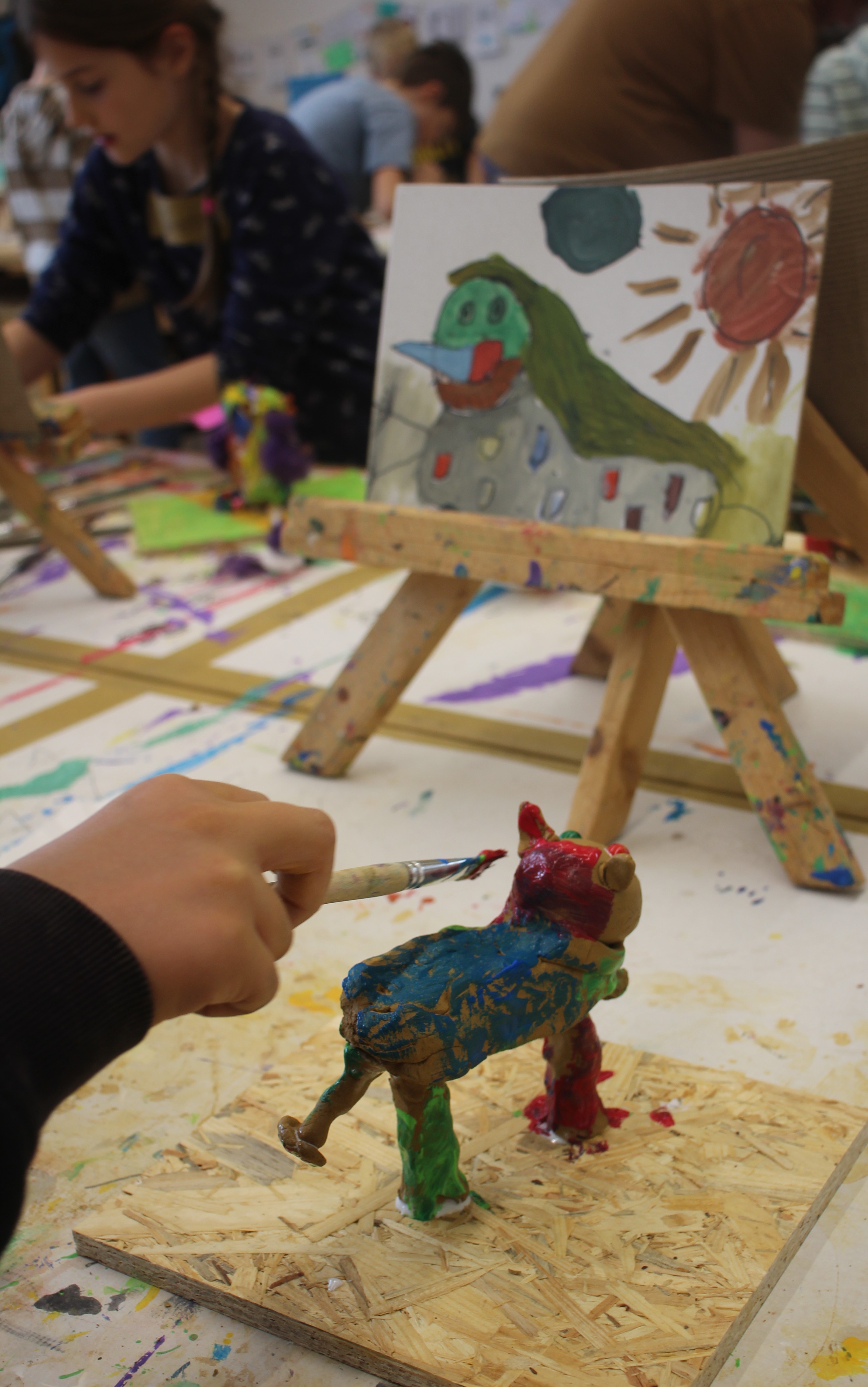 Eintauchen in eine tolle Bilderwelt, mitmachen und gestalten hieß es bei dem Projekt: „Mitmachausstellung“. Ohne Sprachbarrieren bot die etwa dreieinhalbstündige Veranstaltung Kindern von 6 bis 11 Jahren eine kreative Möglichkeit der Teilhabe. Die künstlerisch aufbereiteten Ausstellungen bestanden aus großformatigen Bäumen und einer riesigen Weltkarte. Fotografien und Schleichfiguren zeigten Tiere, Menschen, Pflanzen und Landschaften, die den Kindern sachkundliches Wissen vermittelten. Außerdem konnten sie in die Rolle von Forscher*innen schlüpfen, sich ein Tier ihrer Wahl aussuchen und zeichnen. Nach einer kurzen Einführung in das Modellieren von Tonplastiken machten die Schüler*innen sich ans Werk: Aus Ton, Hölzern, Sägespänen, Perlen und vielem mehr entstanden individuelle, kleine Arbeiten. Zum Abschluss jeder Veranstaltung gab es eine Ausstellung füreinander: Die Kinder erzählten sich gegenseitig, was sie gestaltet und wie sie gearbeitet hatten. Die fertigen Arbeiten wurden in der Schule ausgestellt und danach von den Kindern mit nach Hause genommen.