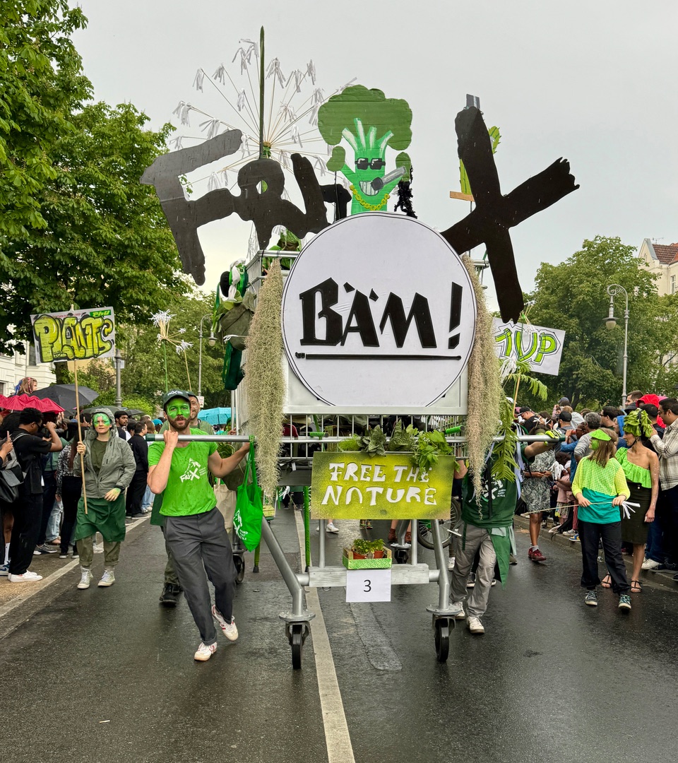 „1 m² Grün“ rückte den Erhalt von städtischen Grünflächen und eines der dringendsten Probleme unserer Zeit in den Fokus: den Verlust der Biodiversität. Als große Pflanzen-Demo zeigte sich das FRI-X gemeinsam mit der Berliner Äcademy für Marching Drums und Künstler*innen der Theatergruppe Grotest Maru beim 25. Straßenumzug des weltberühmten Karnevals der Kulturen. Die Kunstwerke waren an zahlreichen kleinen und einem riesigen Einkaufswagen befestigt, die voller selbstgebauter und selbst ausgesäter Pflanzen steckten. Diese hatten die Teilnehmer*innen entweder selbst gezogen oder zu Hunderten von Gartenarbeitsschulen in Friedrichshain-Kreuzberg und Neukölln als Spende erhalten. Mit riesigen Pusteblumen war die Gruppe schon von weitem gut erkennbar. Die Besonderheit des Projekts lag in der Einbindung ganz unterschiedlicher Jugend- und Schüler*innengruppen, die normalerweise nicht oder nicht gemeinsam an einem solchen Vorhaben hätten teilnehmen können. In künstlerischen Werkstätten wurde in verschiedenen Grund-, Gemeinschafts-, Privat-, Sekundarschulen und Gymnasien im Bezirk intensiv und schulübergreifend gearbeitet. Unter Anleitung von Künstlerinnen konnten die Teilnehmenden eine Woche lang den Schulraum gegen ein Kunstatelier, eine Bühne oder eine Werkstatt eintauschen. Darüber hinaus wurden auch Jugendliche eingebunden, die ihre Freizeit, Ferien oder Wochenenden in Kursen der Jugendkunstschule verbringen. Gemeinsam mit interessierten Eltern, Künstlerinnen und Lehrer*innen nahmen sie am abschließenden Umzug teil, der weltweit über Fernseher und Monitore lief. Nach der Veranstaltung fanden alle Elemente eine neue Verwendung: Die Pflanzen wuchsen weiter im Garten, die Materialien dienten als Kompost oder als Kunstwerke an den Wänden.
