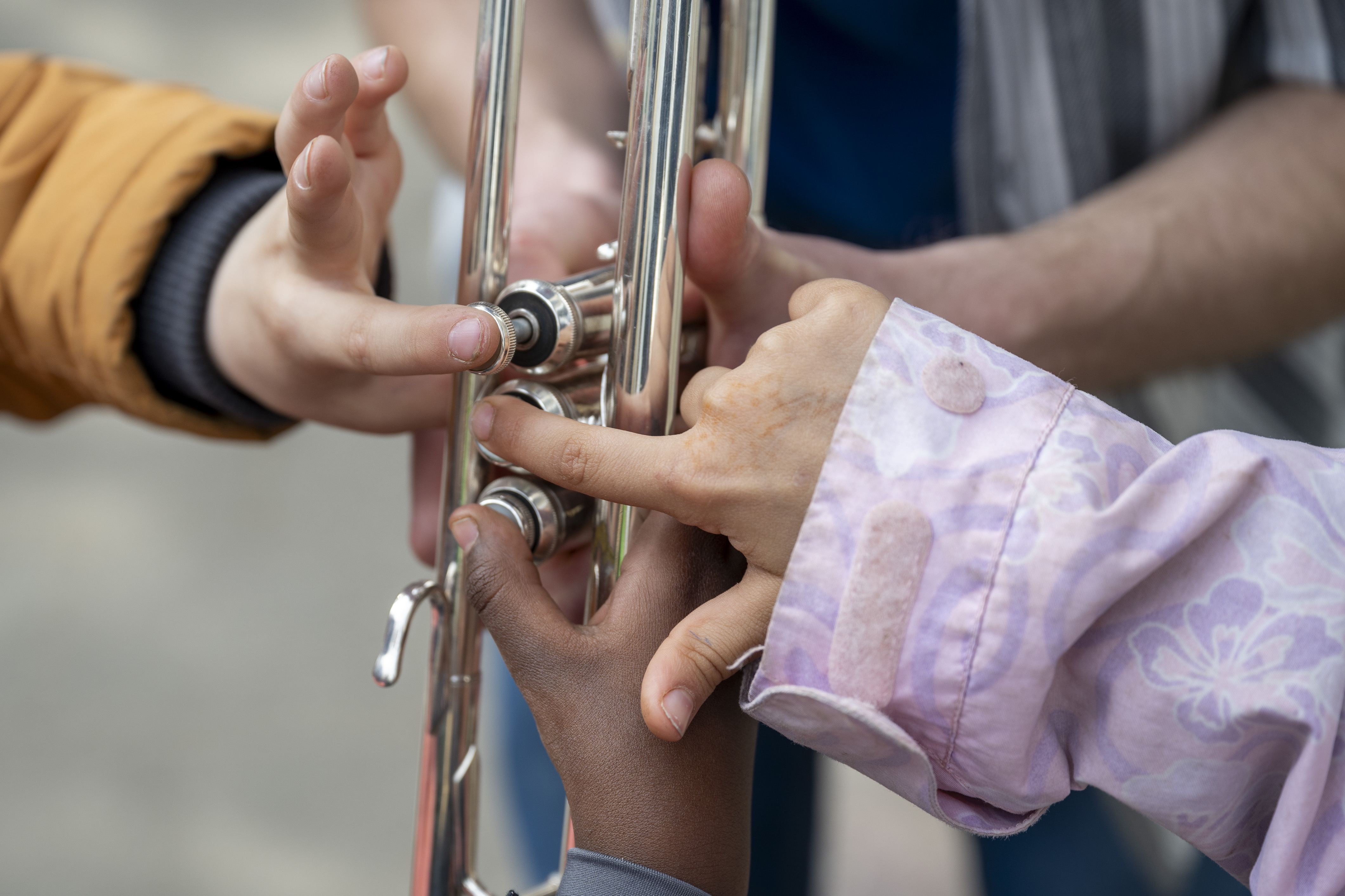 Das Projekt „Brass ist krass“ hat bewiesen, wie einfach es ist, mit den Mitteln der Musik Brücken zwischen Generationen, Menschen und Kulturen zu bauen. So braucht es weder besonders teure und hochwertige Instrumente noch eine besondere Bühne, um Menschen zu erreichen. Es reicht auch ein Trichter mit einem Plastikschlauch, der klingt wie eine verzerrte Trompete und Menschen zum Lachen bringt. Auch ein nicht genutzter Parkplatz kann mit dem Engagement und der liebevollen Gestaltung Einzelner zu einem tollen Ort für ein Stadtteilkonzert werden und Menschen zusammenbringen. „Brass ist krass“ fand im Hort Kirchteich statt. Durch die Teilnahme an dem Projekt hatten die Kinder die Möglichkeit, mit verschiedenen Instrumenten wie Klavier, Gitarre und Trompete zu experimentieren. Die Workshopleiter*innen aus der Band „Frohe Zukunft“ vermittelten die Grundlagen von Rhythmen, starteten partizipative Klangexperimente, bauten Instrumente, ermutigten die Teilnehmer*innen zu eigener Textarbeit und gestalteten Kostüme für einen gemeinsamen Auftritt von Band und Kindern im öffentlichen Raum. Der Auftritt vor Publikum in eigens dafür bedruckten T-Shirts war ein Highlight für alle Anwesenden.