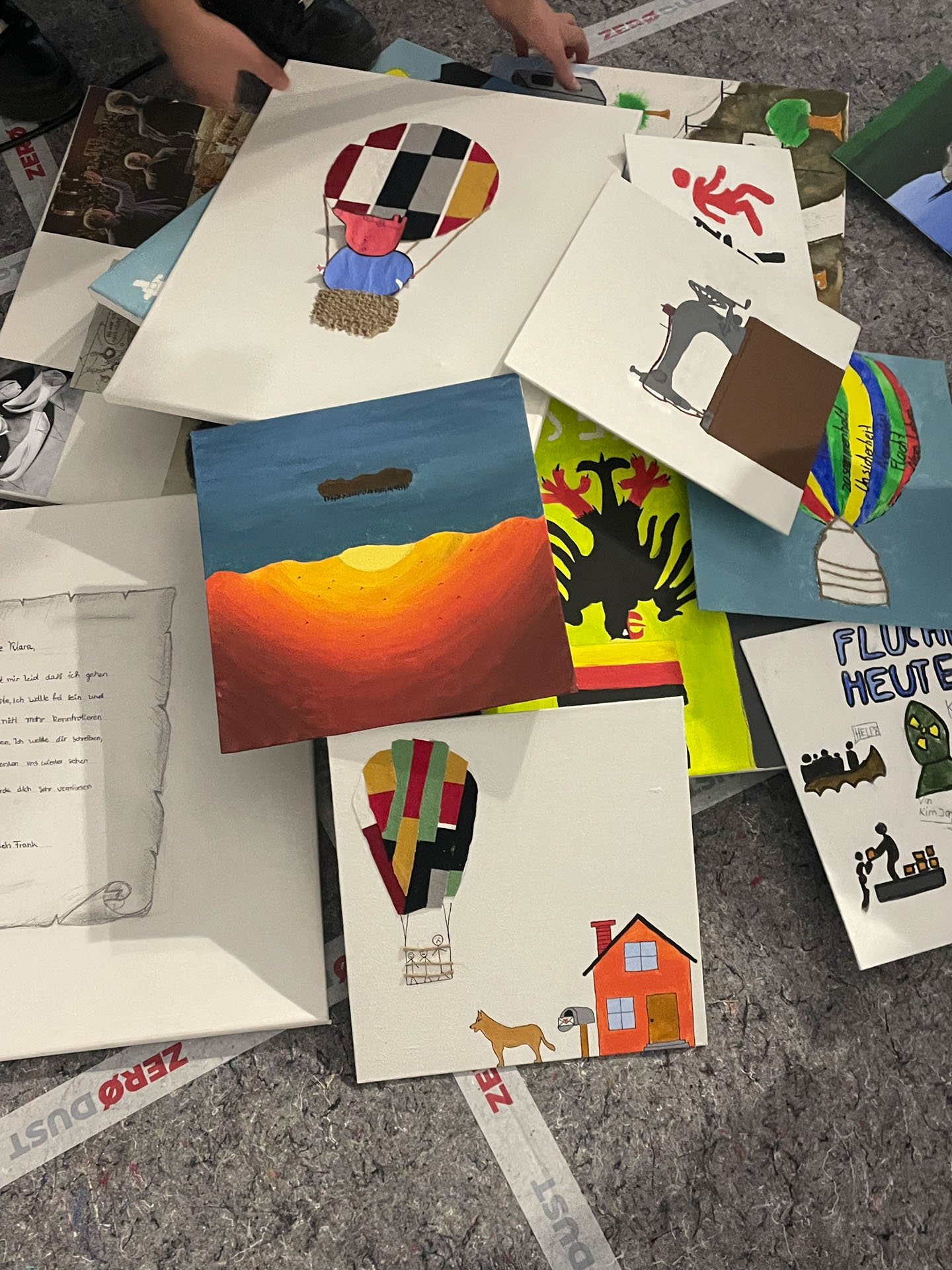 Im Jahr 1979 gelang zwei Familien eine spektakuläre Flucht aus der DDR: Im selbstgenähten Heißluftballon überwanden sie die deutsch-deutsche Grenze und landeten wohlbehalten bei Naila im Nordosten Bayerns. Im Rahmen des Projekts „Ballon“ beschäftigten sich Schüler*innen der Mittelschule vorort mit dem historischen Ereignis, mit ihren eigenen Erfahrungen mit Flucht und Vertreibung, mit den Ursachen dafür und mit den Hoffnungen, die mit einem Neuanfang in einem fremden Land verbunden sind.Ab Oktober 2024 begann die konzeptionelle und Recherchearbeit. Von Januar bis März entstanden Bilder zu drei Themenbereichen. Im Juli wurden die einzelnen Arbeiten zum Tryptichon arrangiert. Im September wurden die Werke zur Eröffnung des neuen Bürger- und Familienzentrums installiert: Am Ausstellungsort des originalen Fluchtballons erhielten die Arbeiten einen prominenten Platz und bildeten eine Brücke zwischen dem historischen Ereignis und der heutigen Lebensrealität junger Menschen. In der Zusammenarbeit des JuKu-Mobils mit der Mittelschule Naila gelang es, die Schüler*innen in die Mitte der Stadtgesellschaft zu holen und ihnen Aufmerksamkeit und Sichtbarkeit zu ermöglichen. Sie wurden mit ihren Wünschen, Empfindungen und Emotionen wahr- und ernstgenommen. Durch die dauerhafte Gestaltung einer Fläche im multifunktional genutzten öffentlichen Gebäude bleiben sie mit ihren Anliegen auch über den konkreten Anlass hinaus präsent.